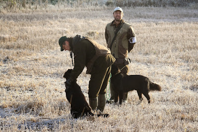 Koe alkoi 1 markkeerauksella ja maaohjauksella. Tehtävät oli aika helpot, mutta markkeerauksessa ongelmaa tuottu laukauksen ja heiton välinen viive ja pudotus paikka rinteeseen. Kutilla jäi markkeeraus saamatta talteen. Ohjaus meni hienosti. Seuraavana oli pari hakua, josta piti 2 damia saada ylös. Koirat lähetiinn vesi alueen yli hakuun. Keli oli aika jäätävä, aamukoirille pakkasta ja iltapäiväkoirille tuulta.. Kutilla jäi hausta löytymättä toinen dami. Seuraava tehtävä oli linja 2 markkeeraus veteen. Paikka näkyykin tuossa ylemmässä kuvassa. Hrrr...sitten lähihakua vedestä ja siten vesiohjaus. Tämä vesiohjaus koitui lopulta myös Kustin kompastuskiveksi, eli vesi hjaukset jäi suorittamatta näiltä sisaruksilta. Lopuksi tuli vielä pitkä 1 markkeeraus pellolle. Lisähaastetta kylmyyteen toi vielä pitkät odottelut kun pari suoritti tehtäviä. Aamusta kisaajat eivät uskaltaneet suomen sääntöjen puitteessa ottaa koirille pyyhkeitä tai loimia mukaan. Onneksi kaikki selvisivät hengissä, katsojia myöten...:)